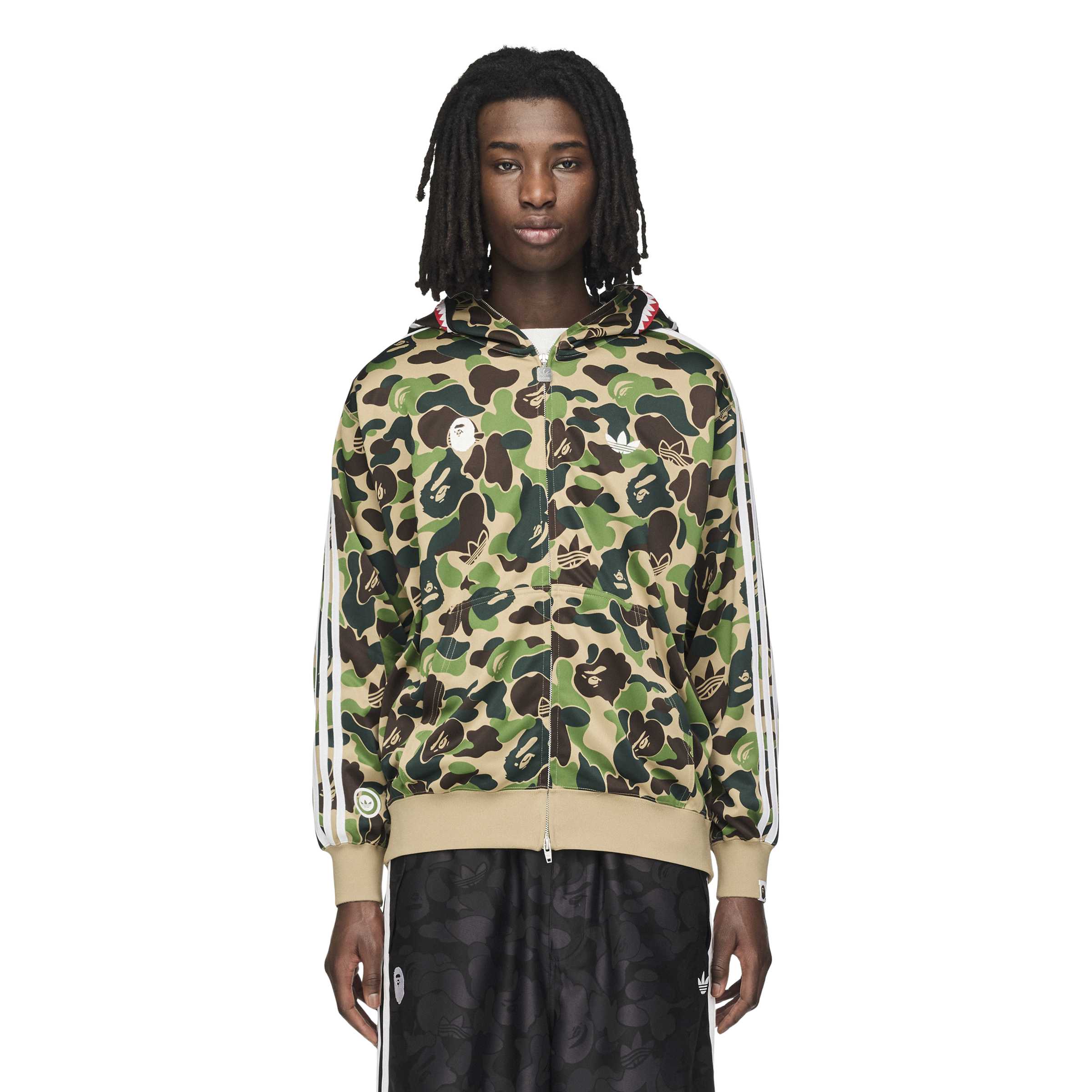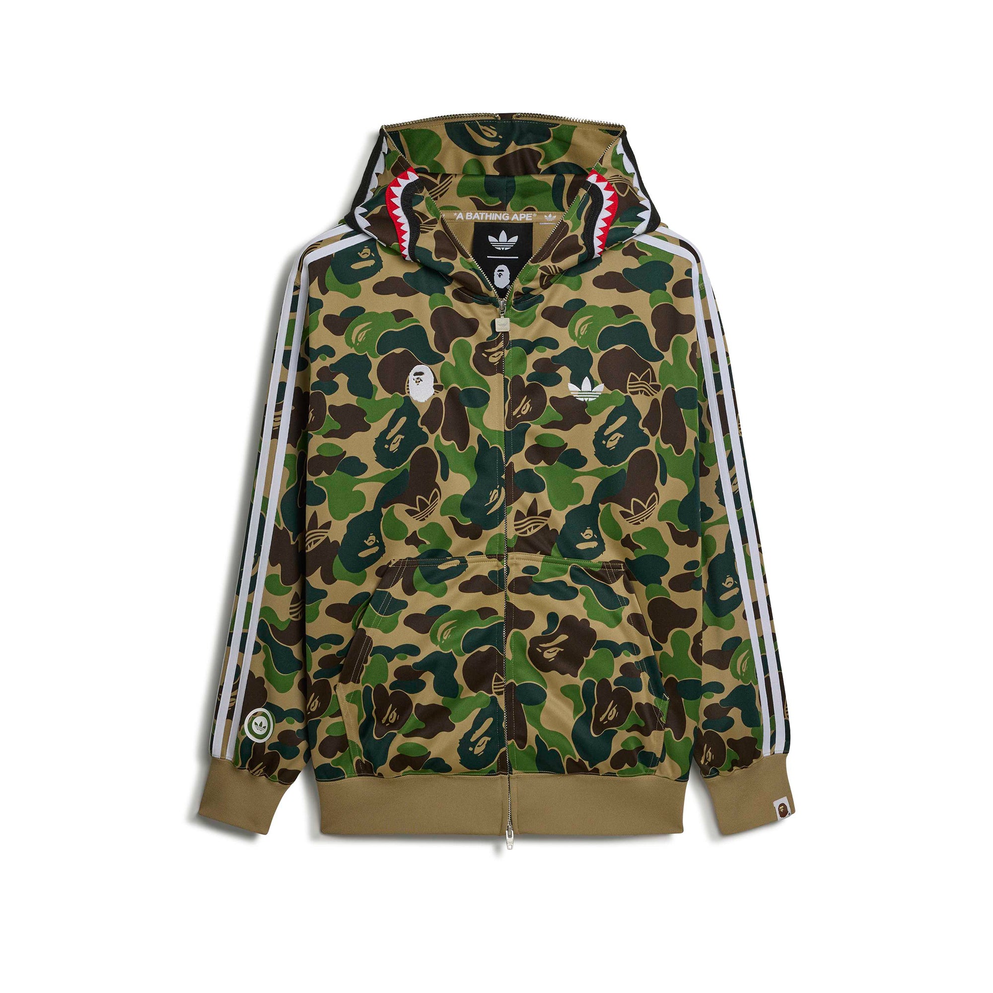 The Shark Track Hoodie BAPE Jacket brings a bold, unmistakable presence to the street, blending adidas Originals heritage with BAPE style in a piece that stands out with confidence. Its loose fit and spacer fabric construction create a relaxed, structured silhouette that layers easily and carries a sharp, contemporary attitude. The hood and full-zip design add everyday versatility. Finished with adidas branding, this hoodie lands with authentic character and a clear streetwear pulse — a statement layer designed to bring an edge to the modern landscape.