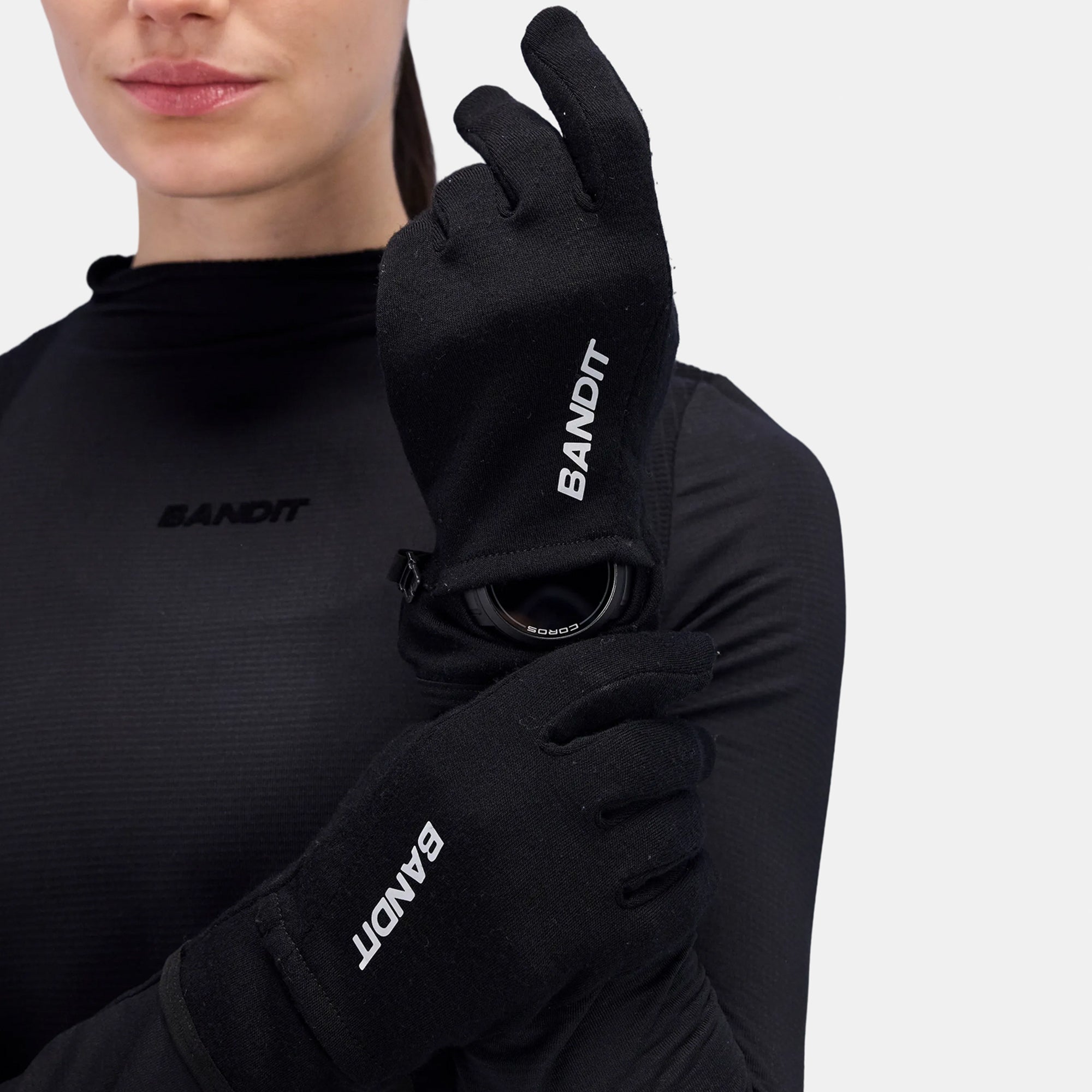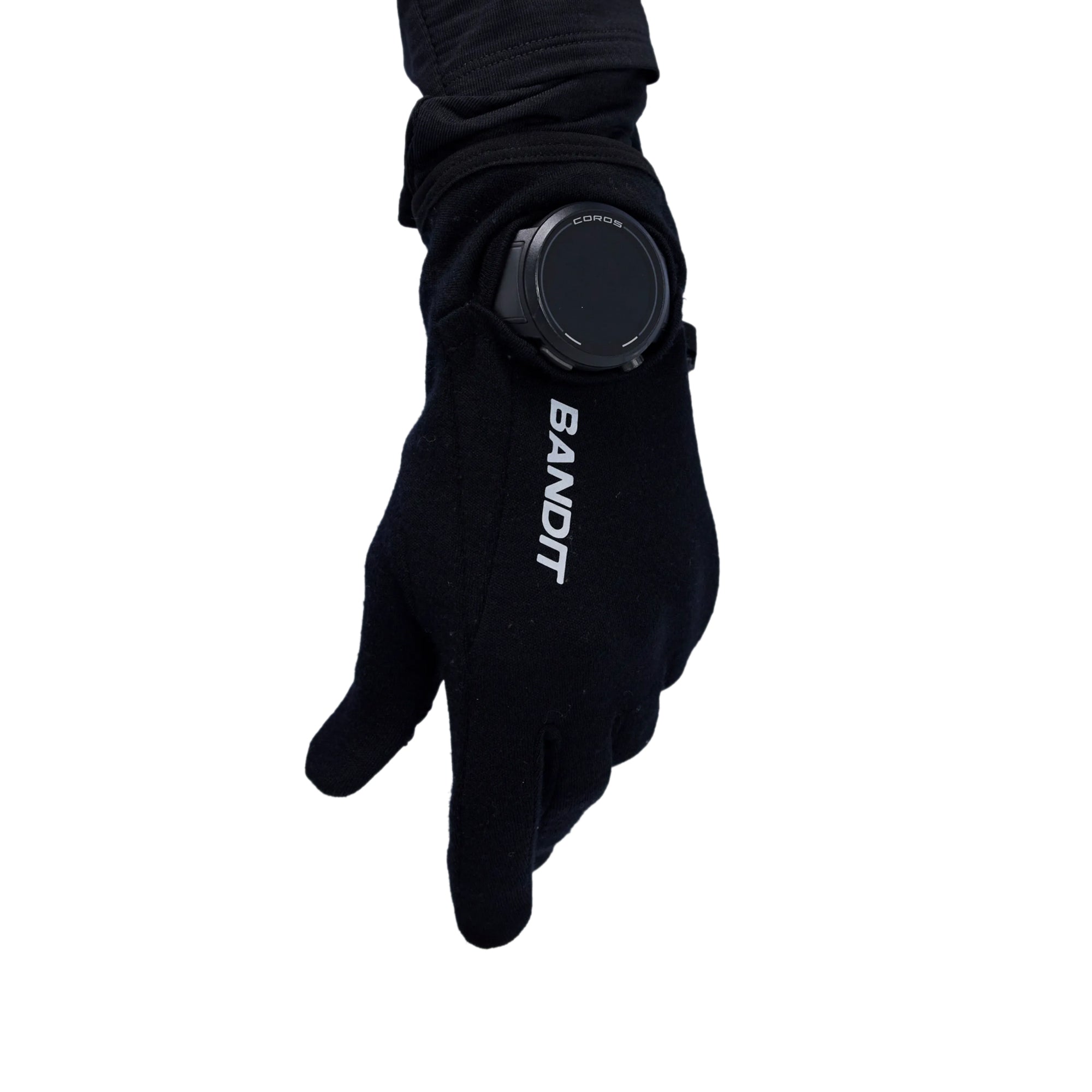Bandit's performance gloves, now updated in a merino wool performance fabric. Silicone grip detail in seasonal custom pattern at the palm. Touch screen friendly fabric at the thumb and forefingers, with an added hatch opening for ease of accessibility, The watch window returns, making this the ultimate training glove. Reflective branding along front seam. Hem finished with elastic binding. Clip detail at side seam ensures this pair isn't easily separated.
