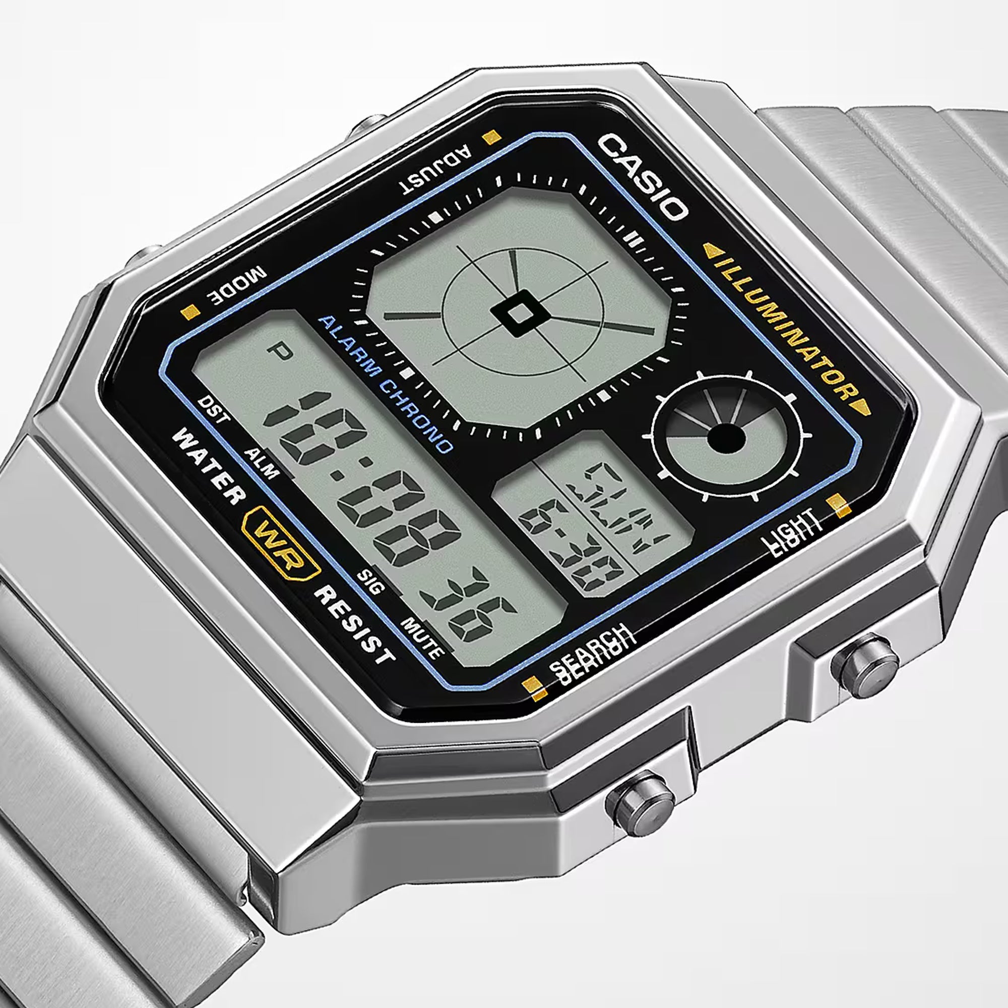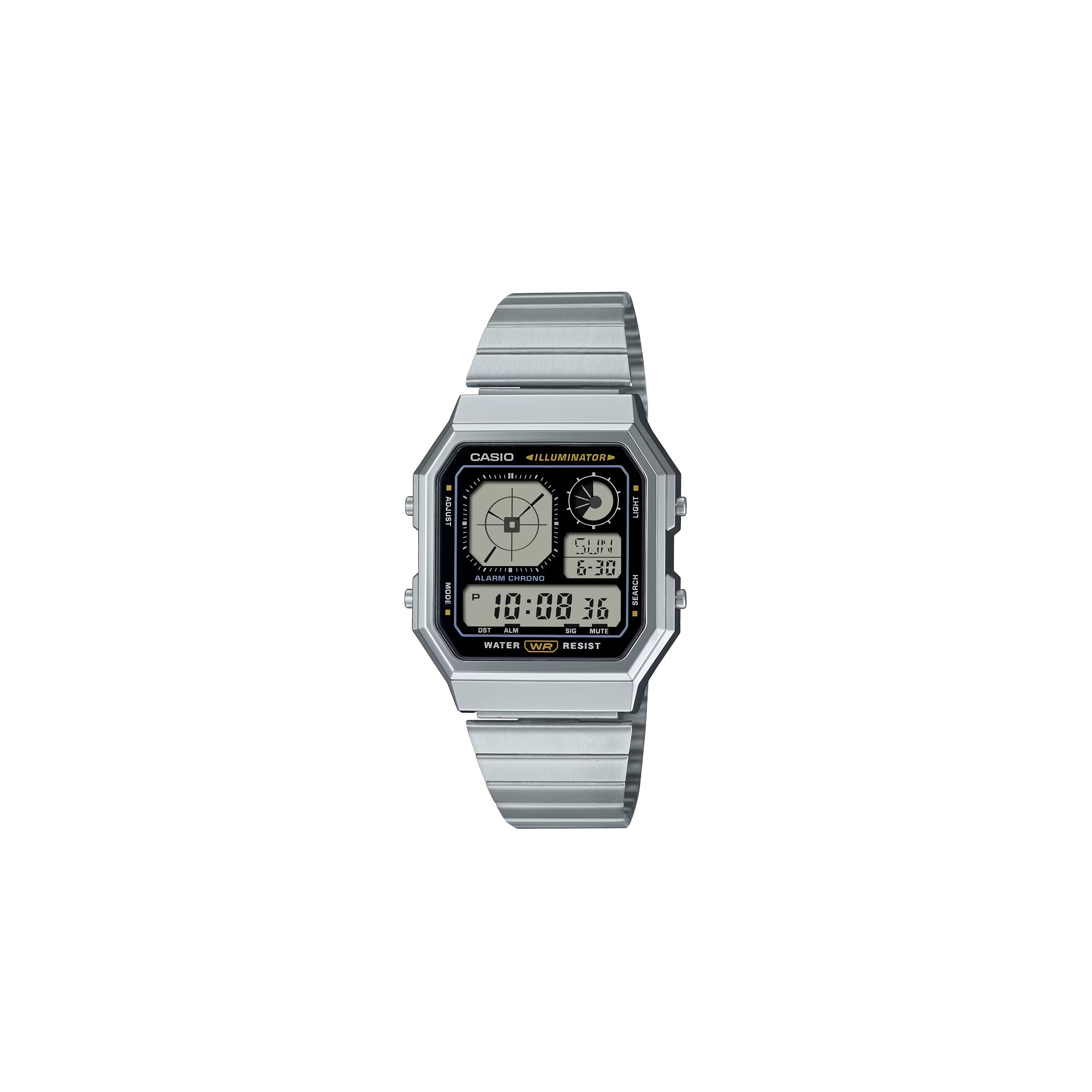 A digital watch featuring an analog-style clock display all wrapped up in the gadgety look you love. A retro-futuristic face is combined with stylish metallic colors and effective accent colors, showcasing a passion for gadgets. Boldly eclectic and practical, too. Packed with handy functions like water resistance for daily use, LED backlight, stopwatch, alarm, and more.