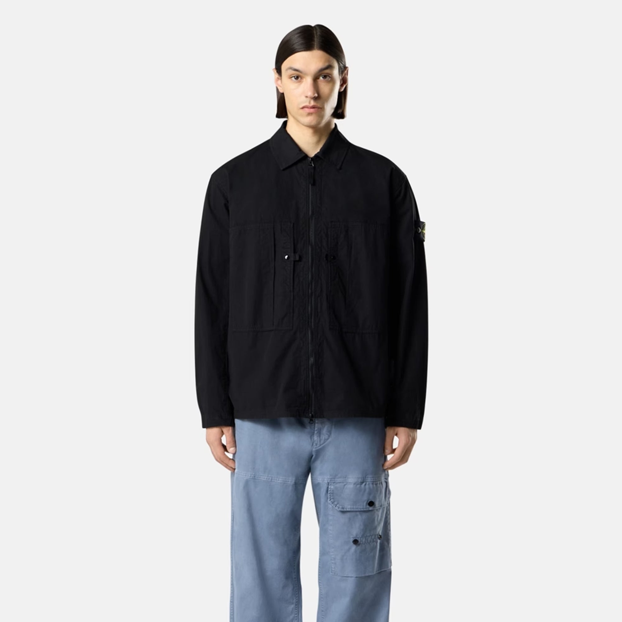 Overshirt in mercerized organic cotton ripstop, featuring front pockets with pleat detail, adjustable snap cuffs, and a two-way zipper fastening. Garment dyed.