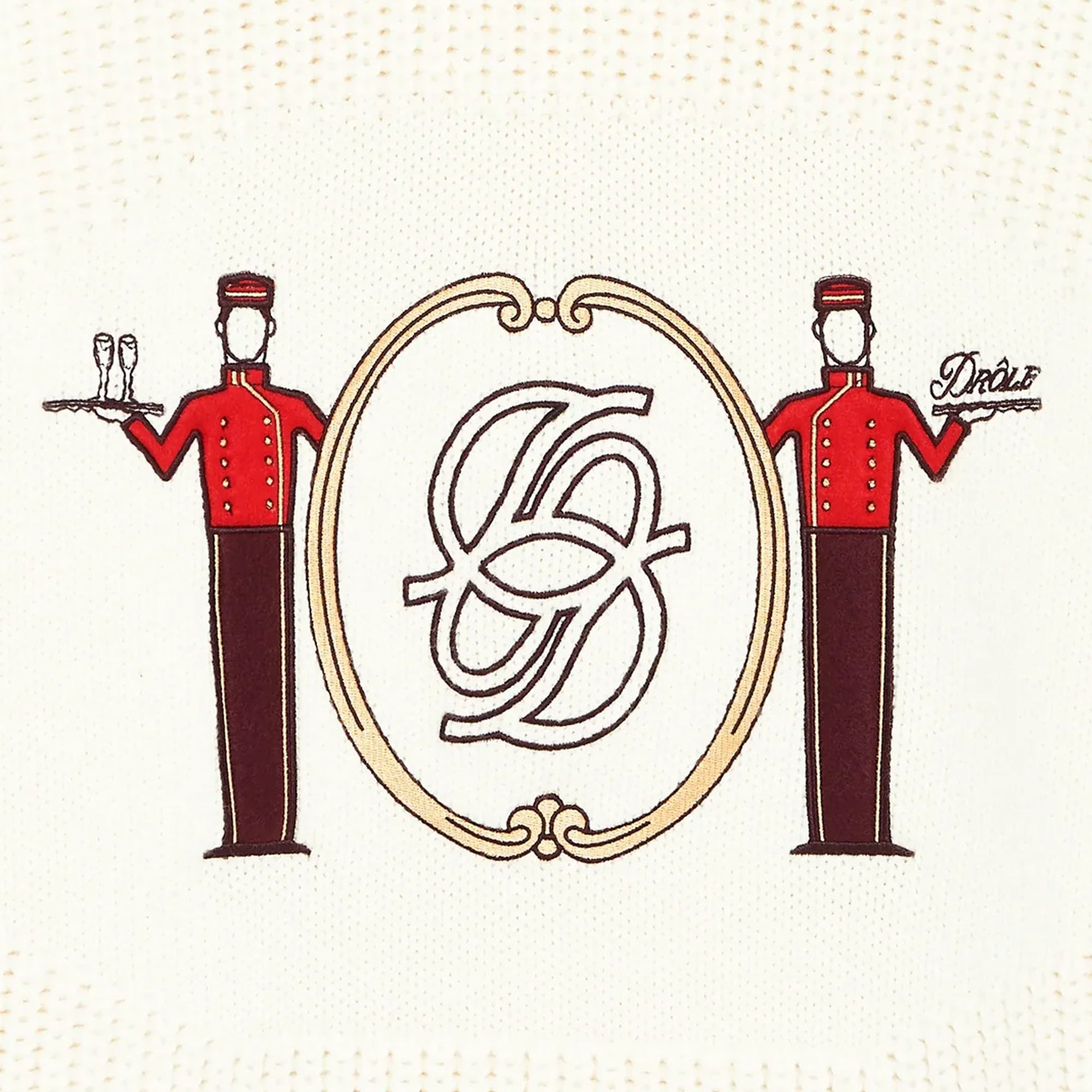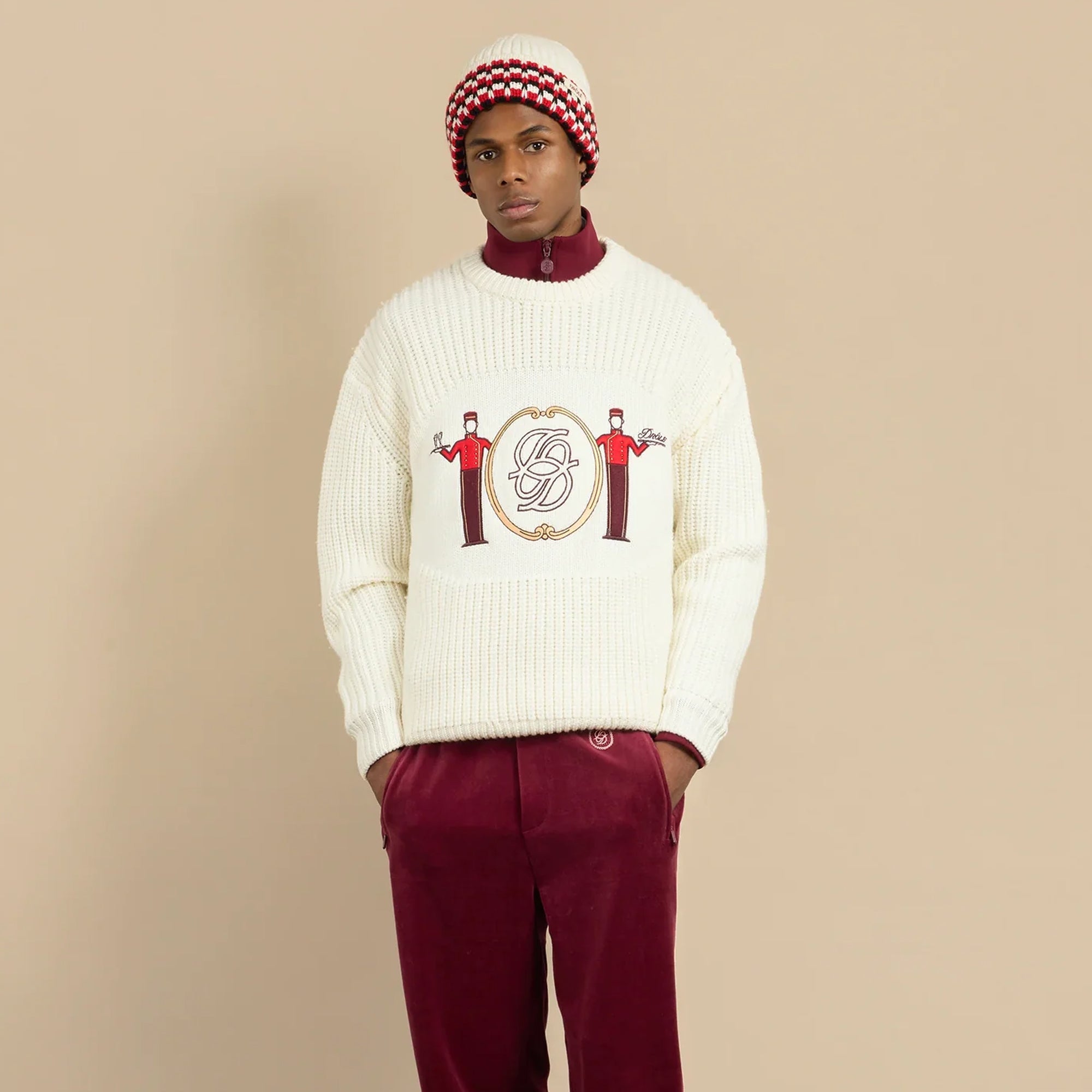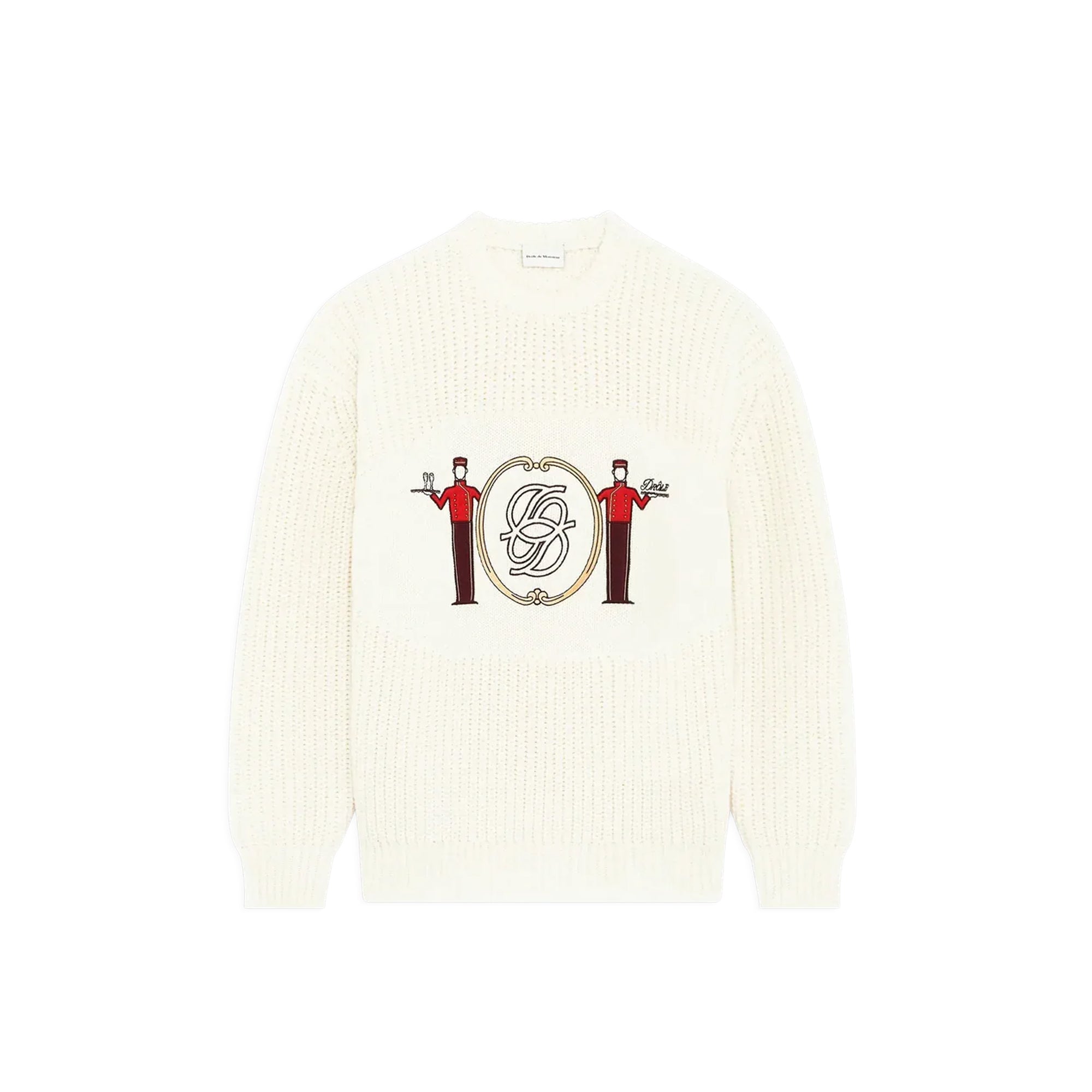 This off-white round collar 100% merino wool sweater features a Groom embroidery on a jersey yoke. It has wide ribs, a loose fit, raglan sleeves and ribbed finishes.