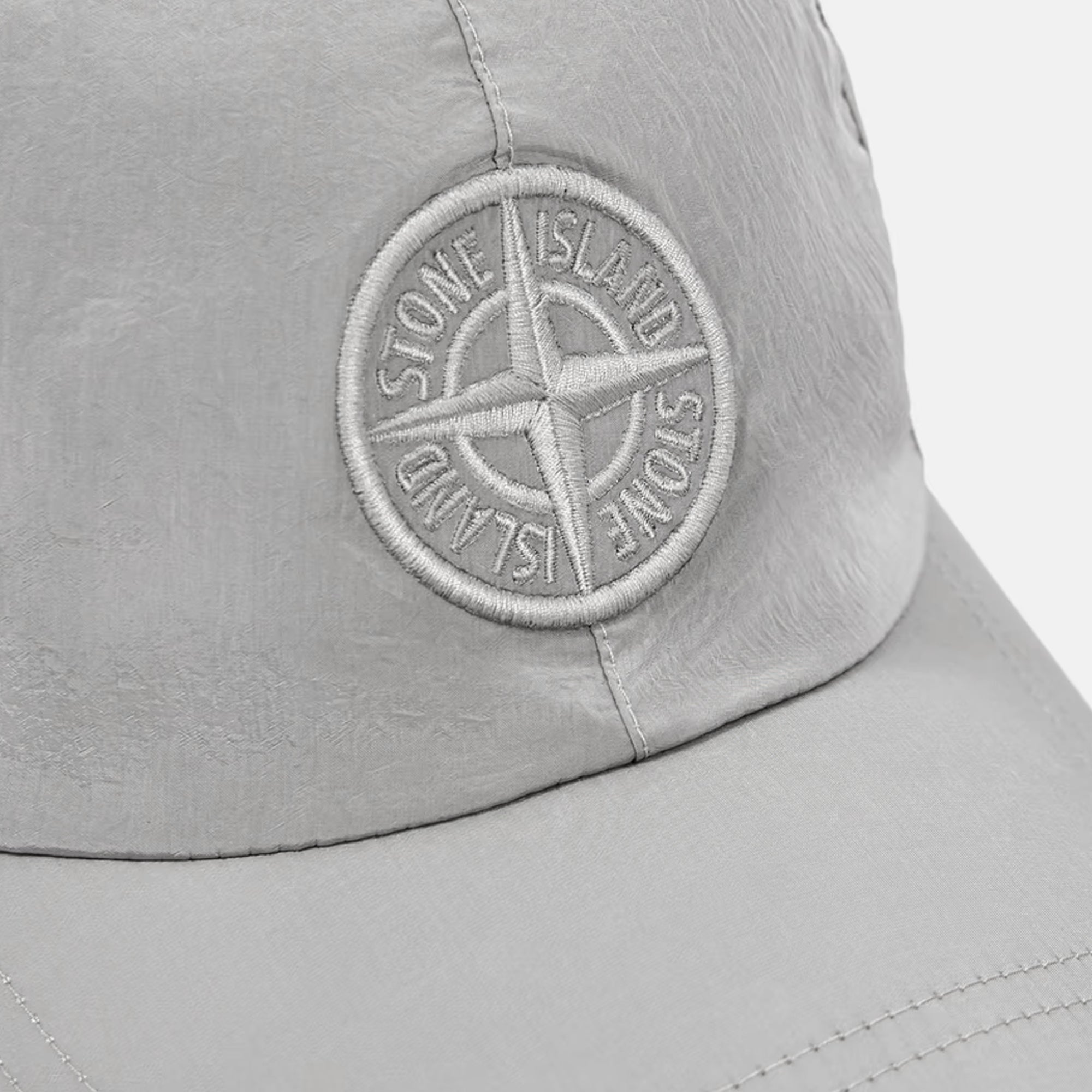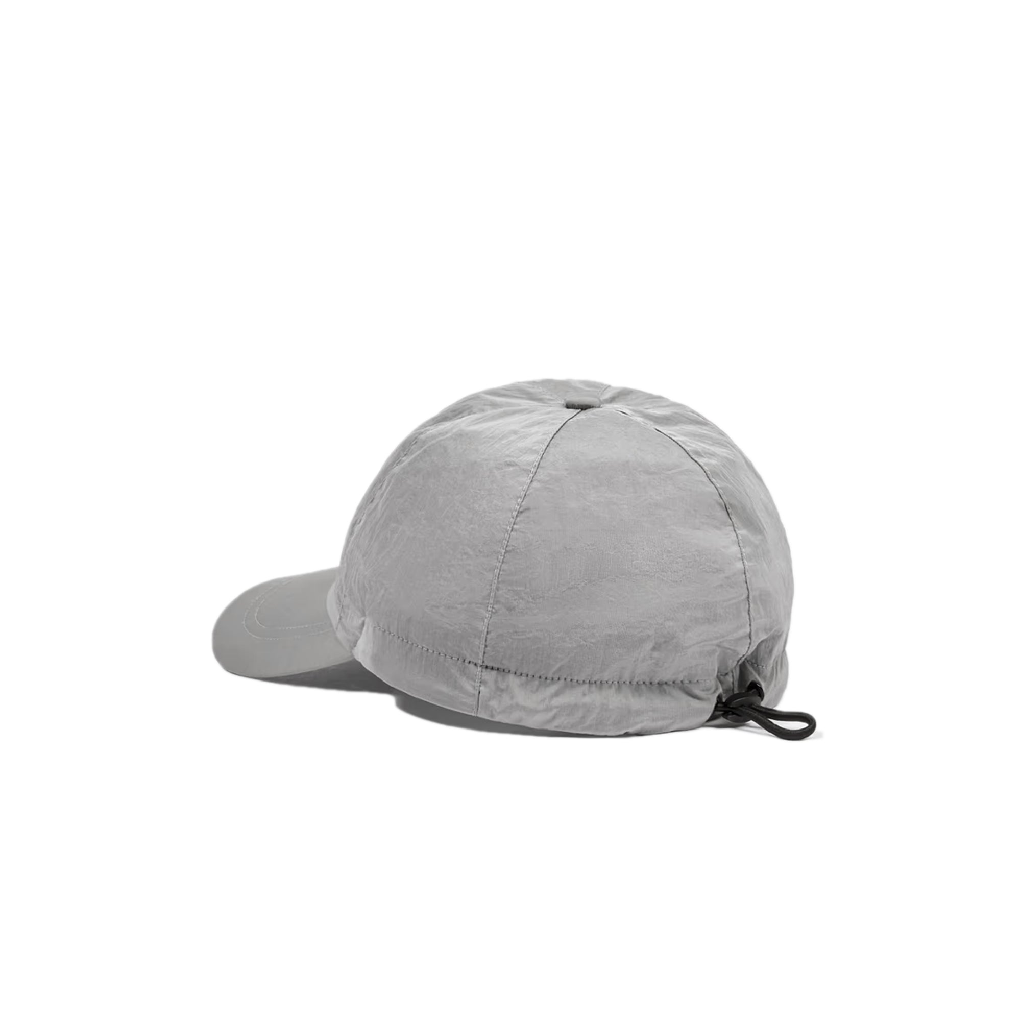 6-panel cap in Nylon Metal made with ECONYL® regenerated yarns, featuring a raised Compass logo embroidery, elasticated drawstring on back, and nylon mesh lining.