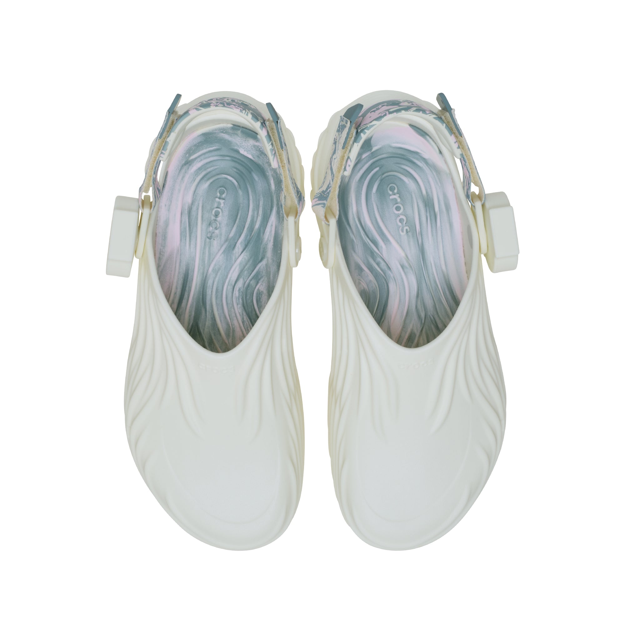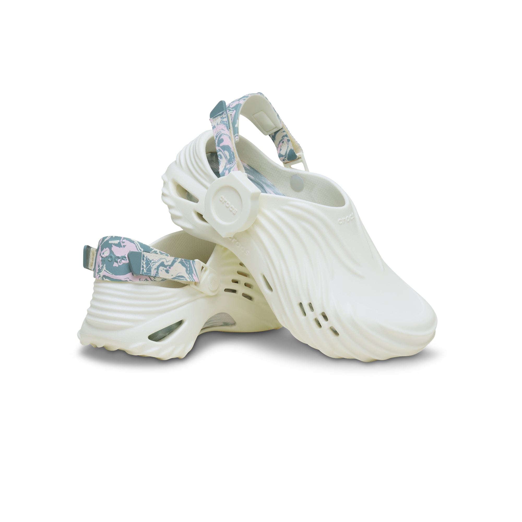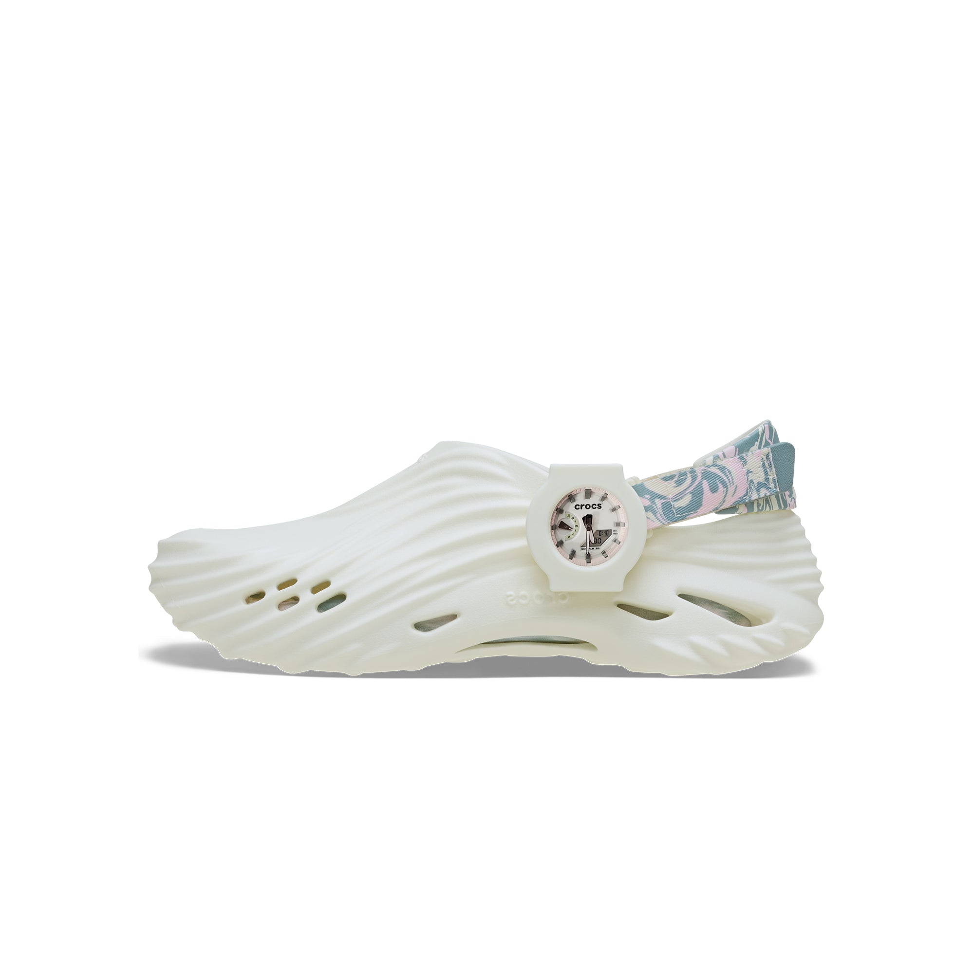 Time doesn’t stand still—it shifts, swirls, and marbles with the exclusive G-SHOCK x Crocs collaboration. This one-of-a-kind design takes shape on the futuristic Echo Wave silhouette sculpted for ultimate comfort. Each step is a canvas for self-expression with an artful marbled print on the adjustable heel strap and a glow in the dark sheen. What makes this style truly unique is a custom dock on the rivet that holds a removeable timepiece that can be swapped between your shoe and a limited-edition watch strap, included in this bundle. Whether the G-SHOCK clock face is worn on your wrist or your ankle, it’s time to make moves.