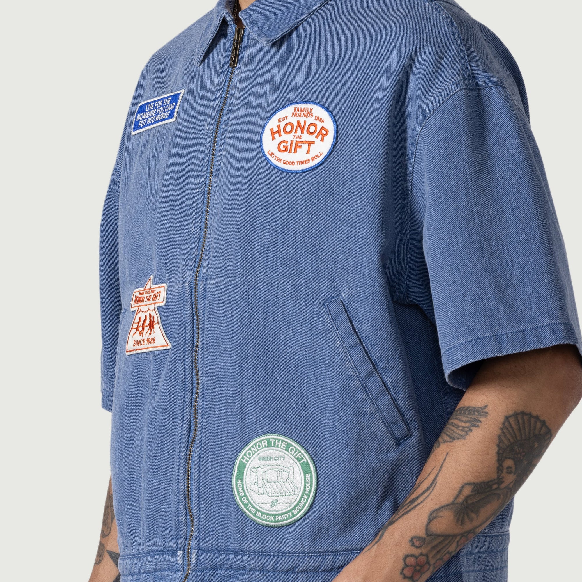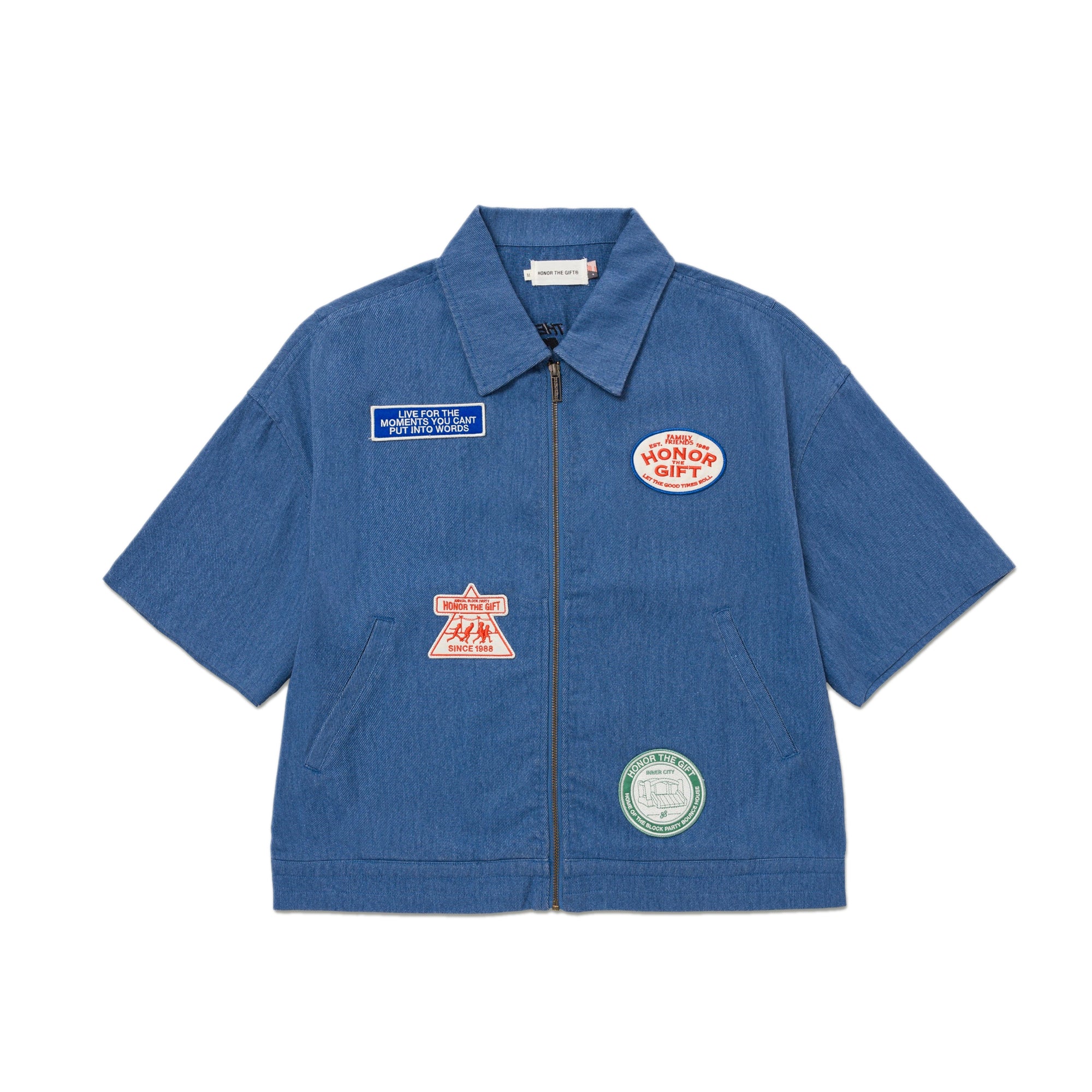 A heavyweight essential built for layering, this full-zip shirt is cut from premium 100% cotton twill, pre-washed for a perfectly broken-in feel. The relaxed, workwear-inspired silhouette gets elevated with custom Block Party patches throughout, adding subtle branding with an artisanal touch.