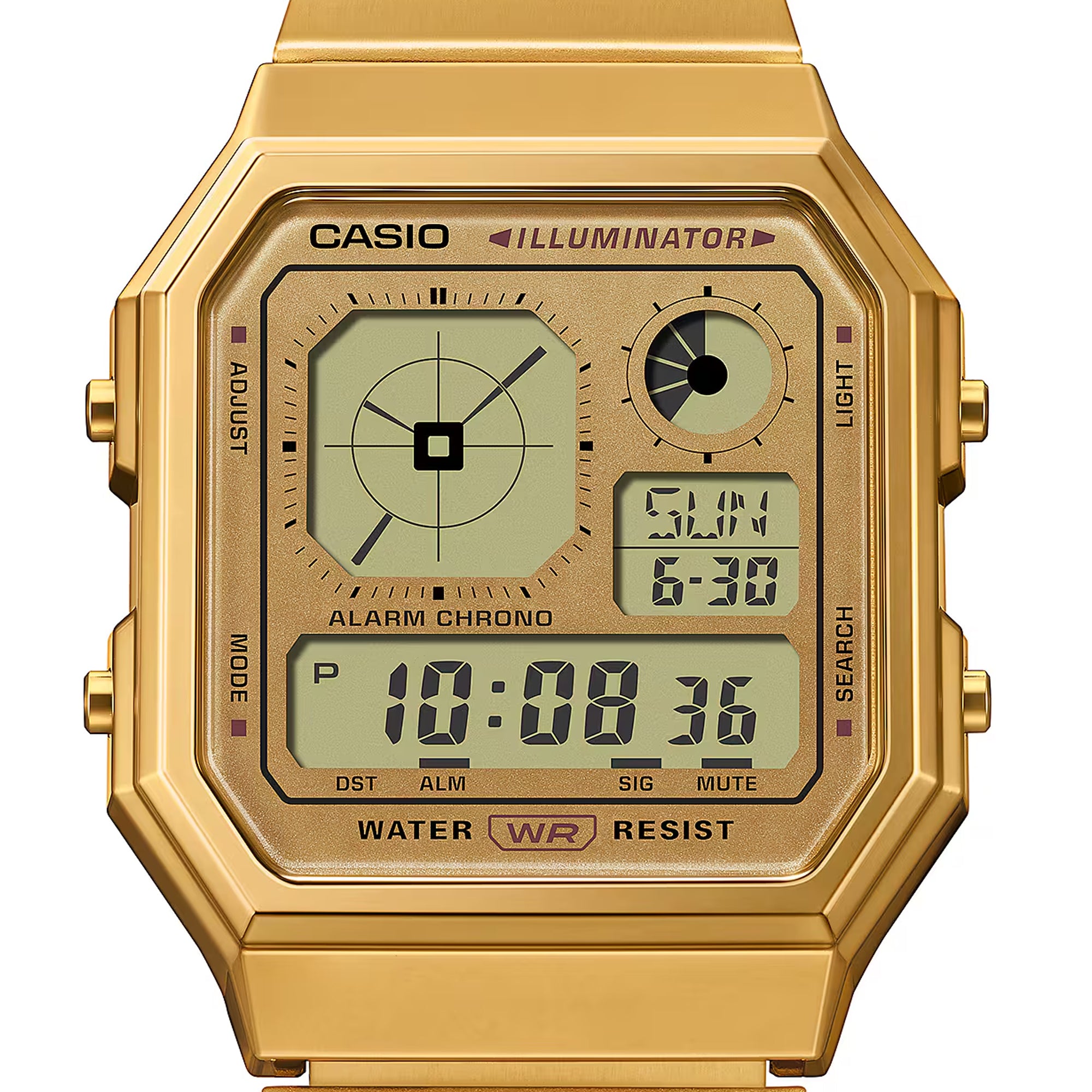 A digital watch featuring an analog-style clock display all wrapped up in the gadgety look you love. A retro-futuristic face is combined with stylish metallic colors and effective accent colors, showcasing a passion for gadgets. Boldly eclectic and practical, too. Packed with handy functions like water resistance for daily use, LED backlight, stopwatch, alarm, and more.